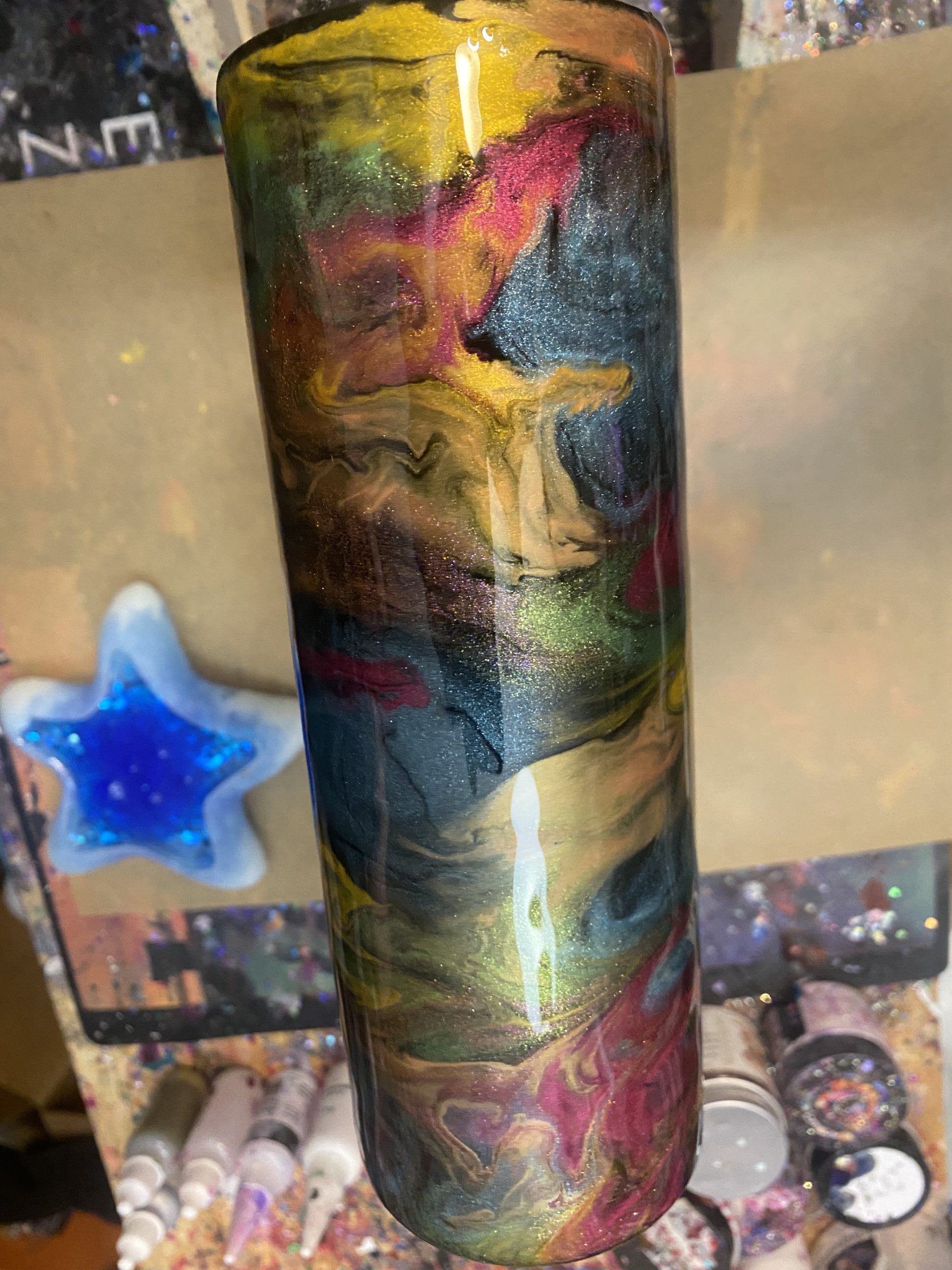 20oz double walled stainless steel tumbler. This tumbler is double wall vacuum insulated to keep hot drinks hot and cold drinks cold. This is a one of a kind item from Miles of Mischief studios.