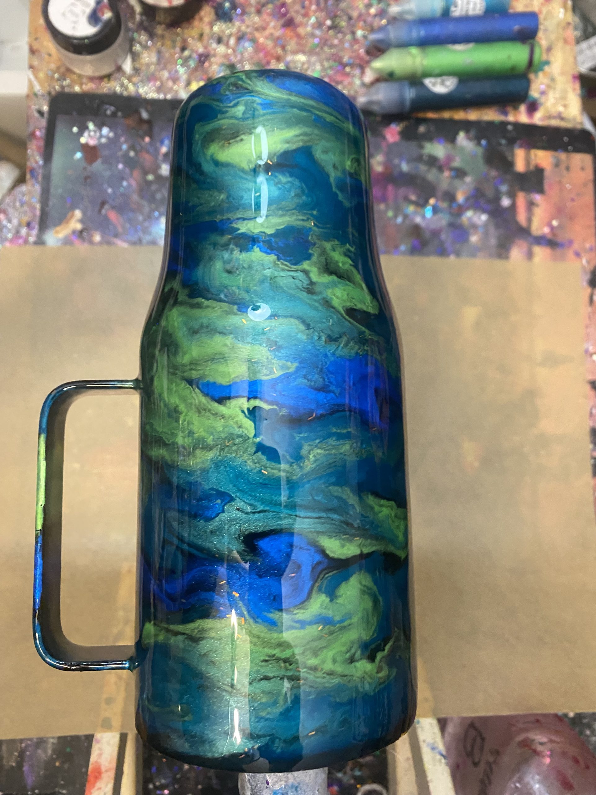 24oz curved double walled stainless steel tumbler. This tumbler is double wall vacuum insulated to keep hot drinks hot and cold drinks cold. This is a one of a kind item from Miles of Mischief studios.