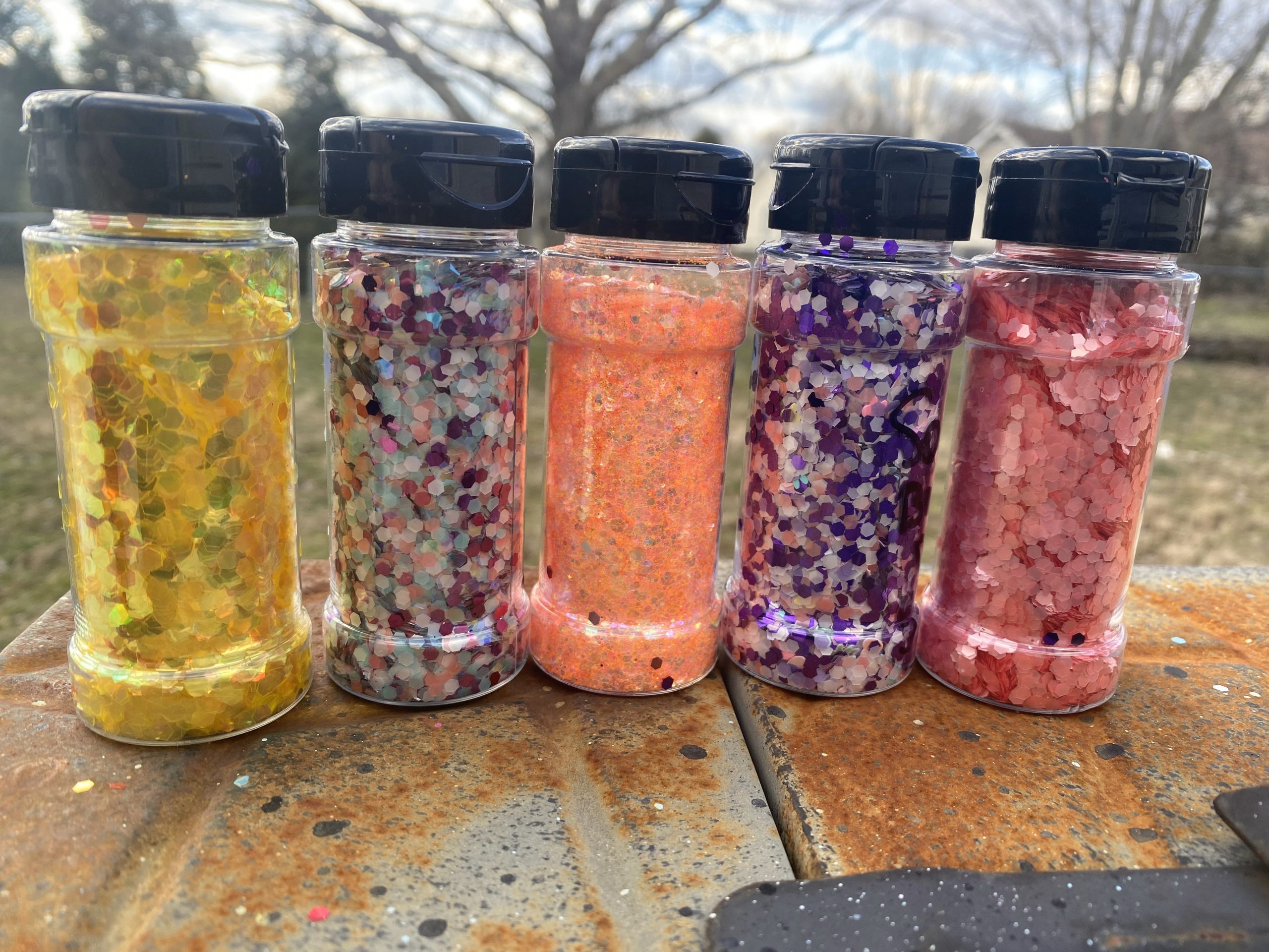 A bundle of (5) individual 1 ounce containers of glitter consisting of Duckling, Show me the Bunny, Spring Vibes, Some Bunny loves you, and Runa from the Mischief Glitter collection. An assortment of chunky glitter made in the USA using only the finest American made materials.